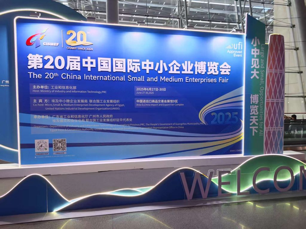 2025年6月27日,第二十屆中國國際中小企業博覽會在廣州啟幕。本屆中博會由工業和信息化部主辦,埃及中小微企業發展局,聯合國工業發展組織擔任主賓方。本屆中博會以“加強合作,擴大交流,互利共贏,攜手發展”為主題,展會規模約8萬平方米,設7個展廳,包括主題展、專業展、配套活動和網上中博會,主題展包括國際展區、港澳臺展區、省區市專精特新展區。專業展包括制造業數字化轉型專題展、工業設計展、智能穿戴與現代鐘表展、老字號企業展。